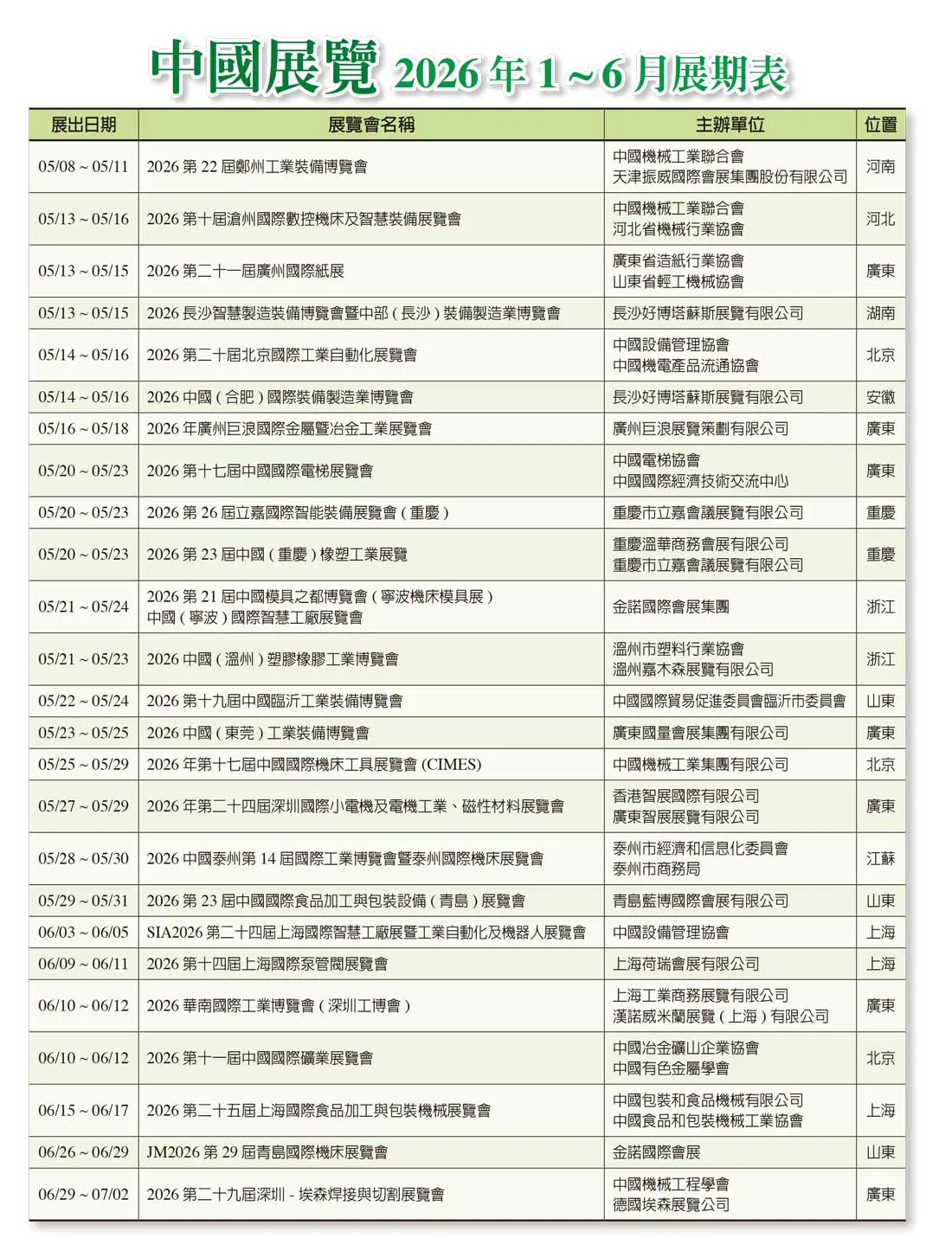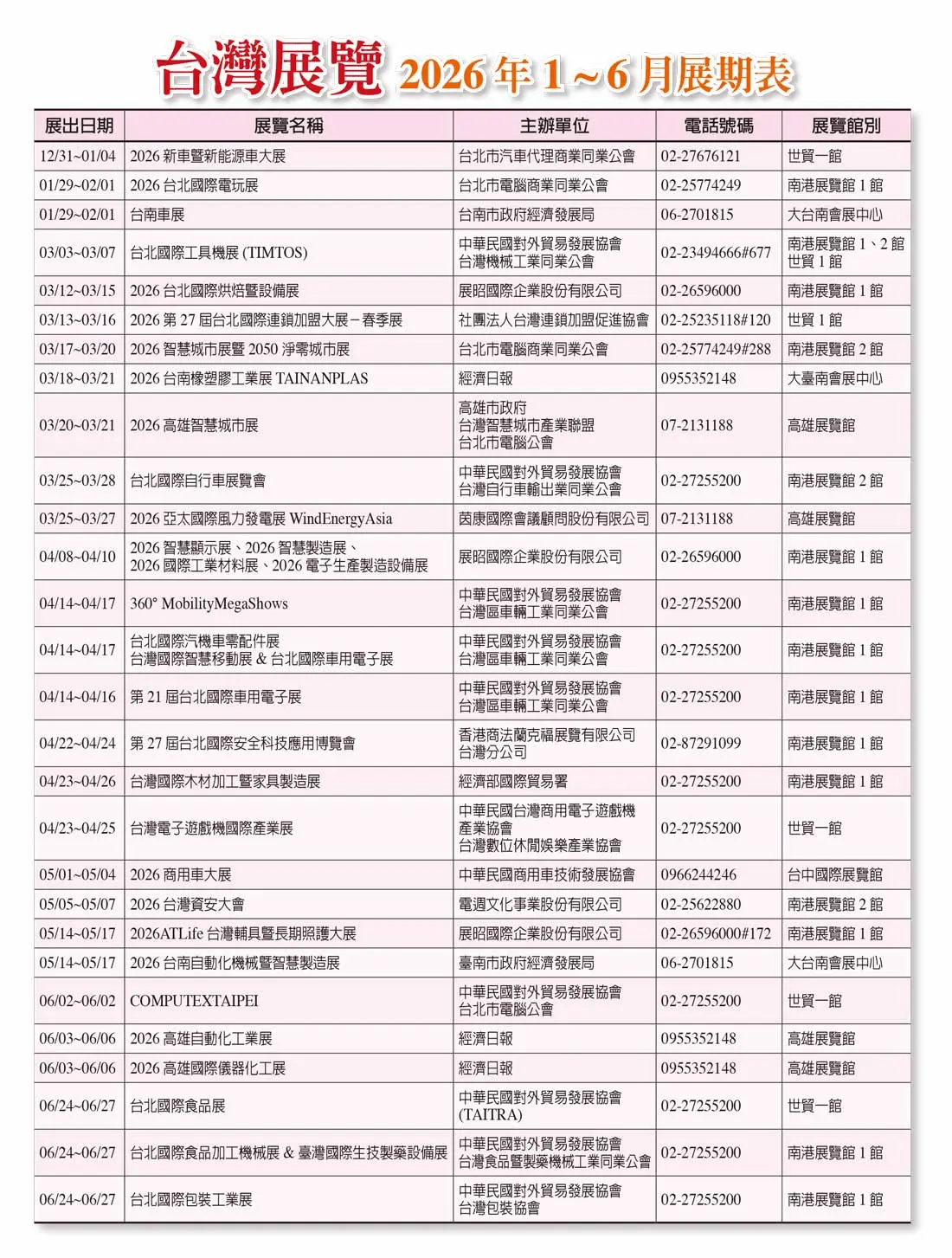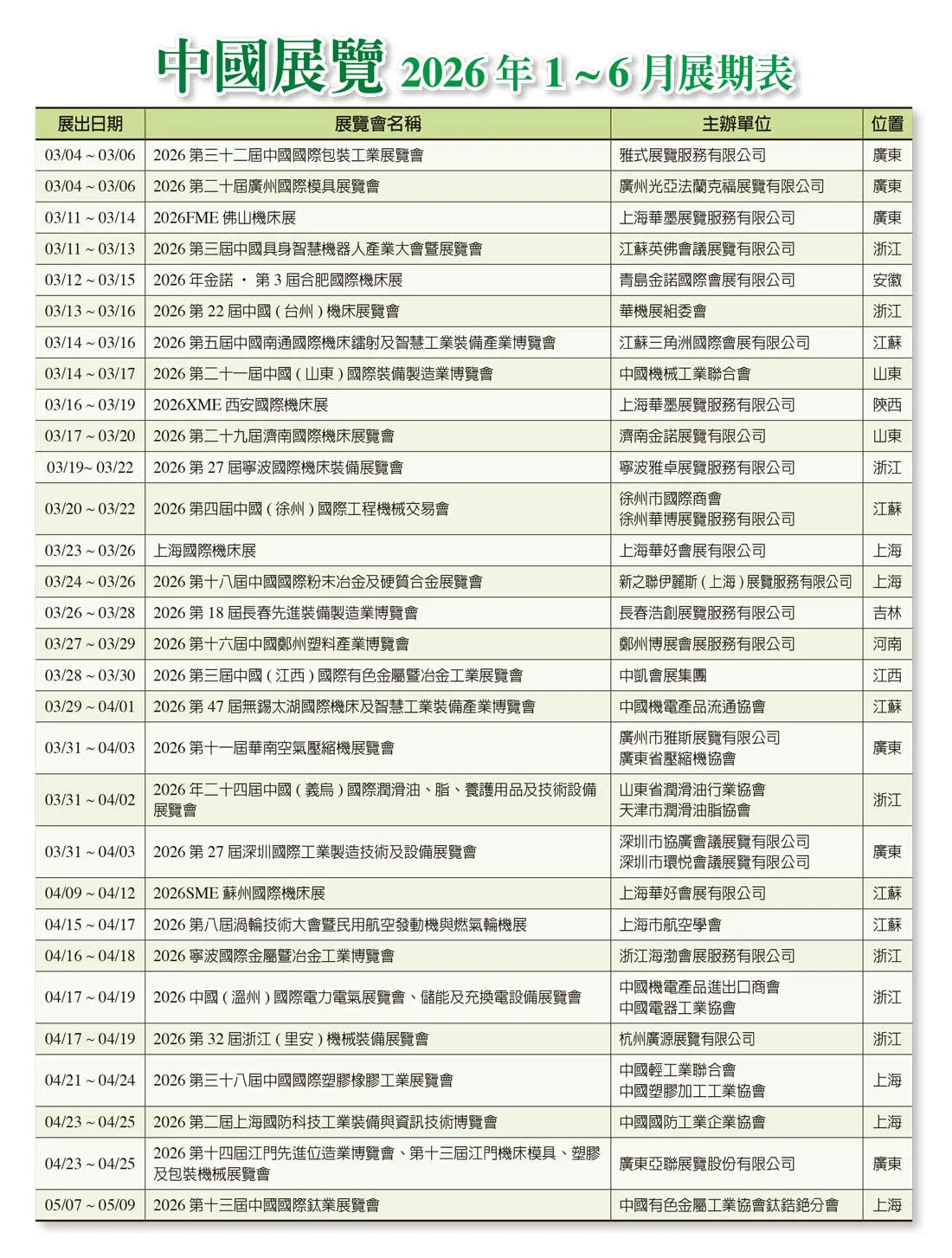 202601-統計資料:台灣展覽、中國展覽(2026年1月~6月展期表) Automechanika 2026-2027年全球展期表 2026-01-07 ● 台灣展覽(2026年1月~6月展期表) ● Automechanika 2026-2027年全球展期表 ● 中國展覽(2026年1月~6月展期表) 上一篇