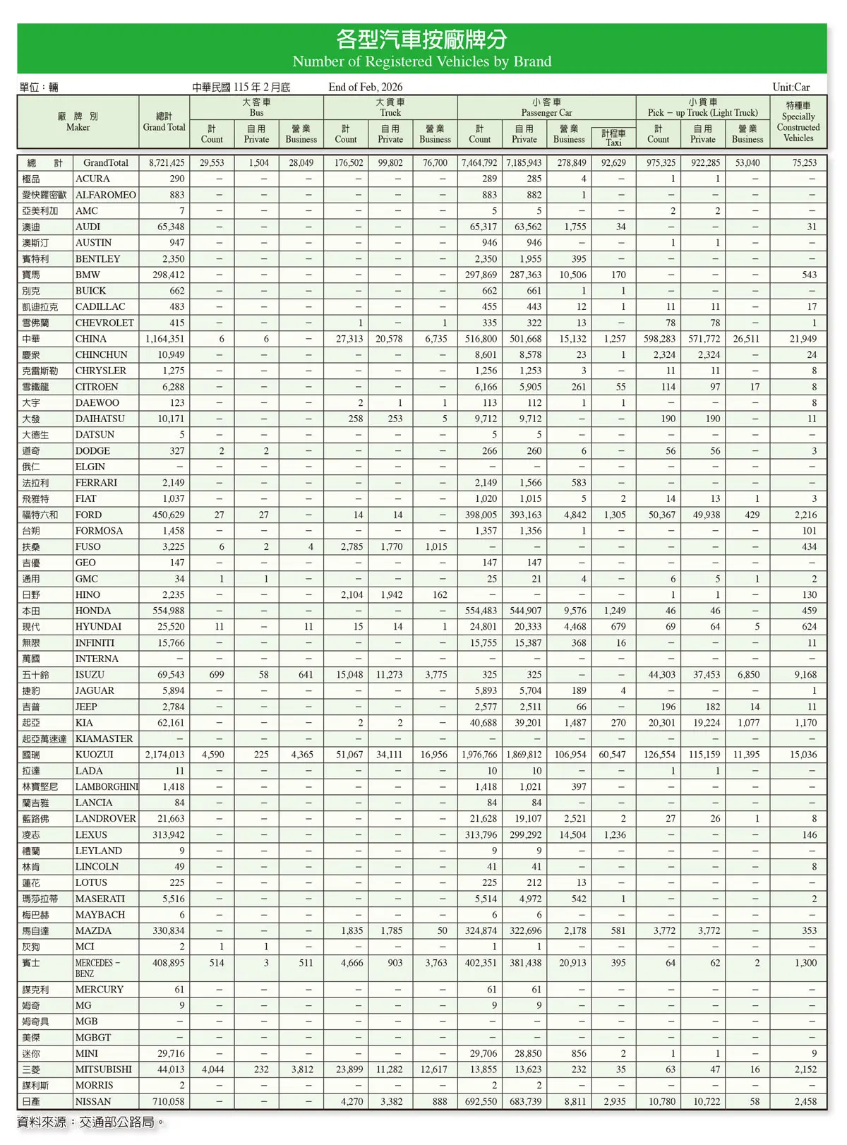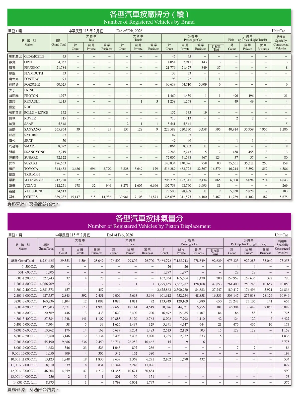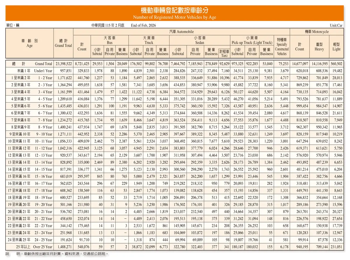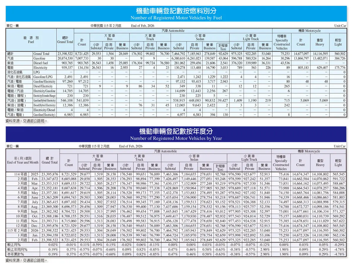 202604---統計資料:台灣車輛分類統計-按廠牌、排氣量、車齡、燃料別、年度分